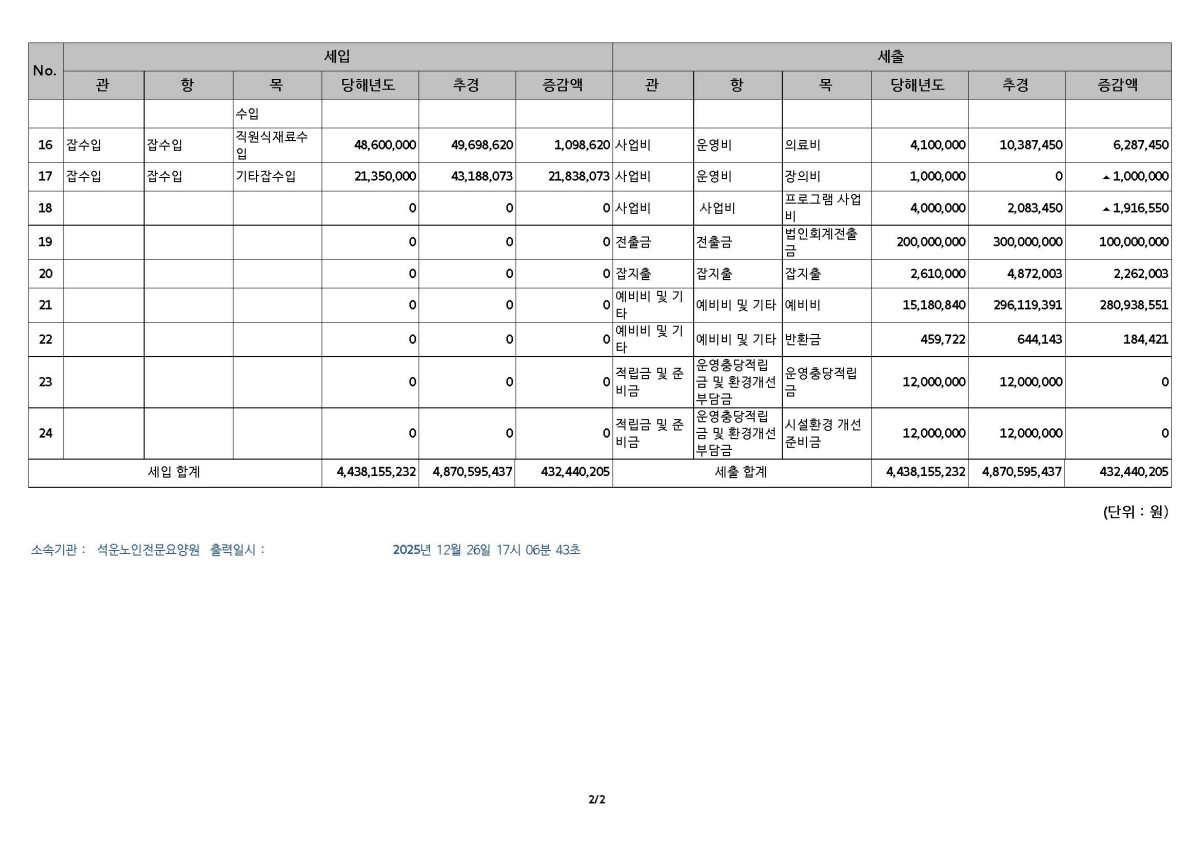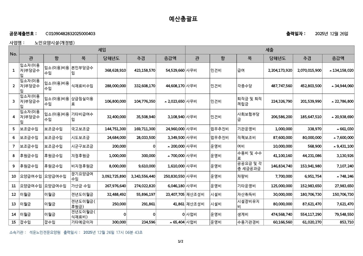 [운영업무관련] 2025년 세입.세출 추경예산서(시설) 페이지 정보 작성자seokun 조회 67회 작성일 2026-01-08 09:33:09 댓글 0 list_alt목록 본문 # 세입.세출 추경예산 총괄표 (석운) # 공고: 2026년01월08일~2026년01월31일 이전글 2026년 세입.세출 예산서 (시설) 다음글2026년 1월 행사계획표 댓글 0 등록된 댓글이 없습니다.