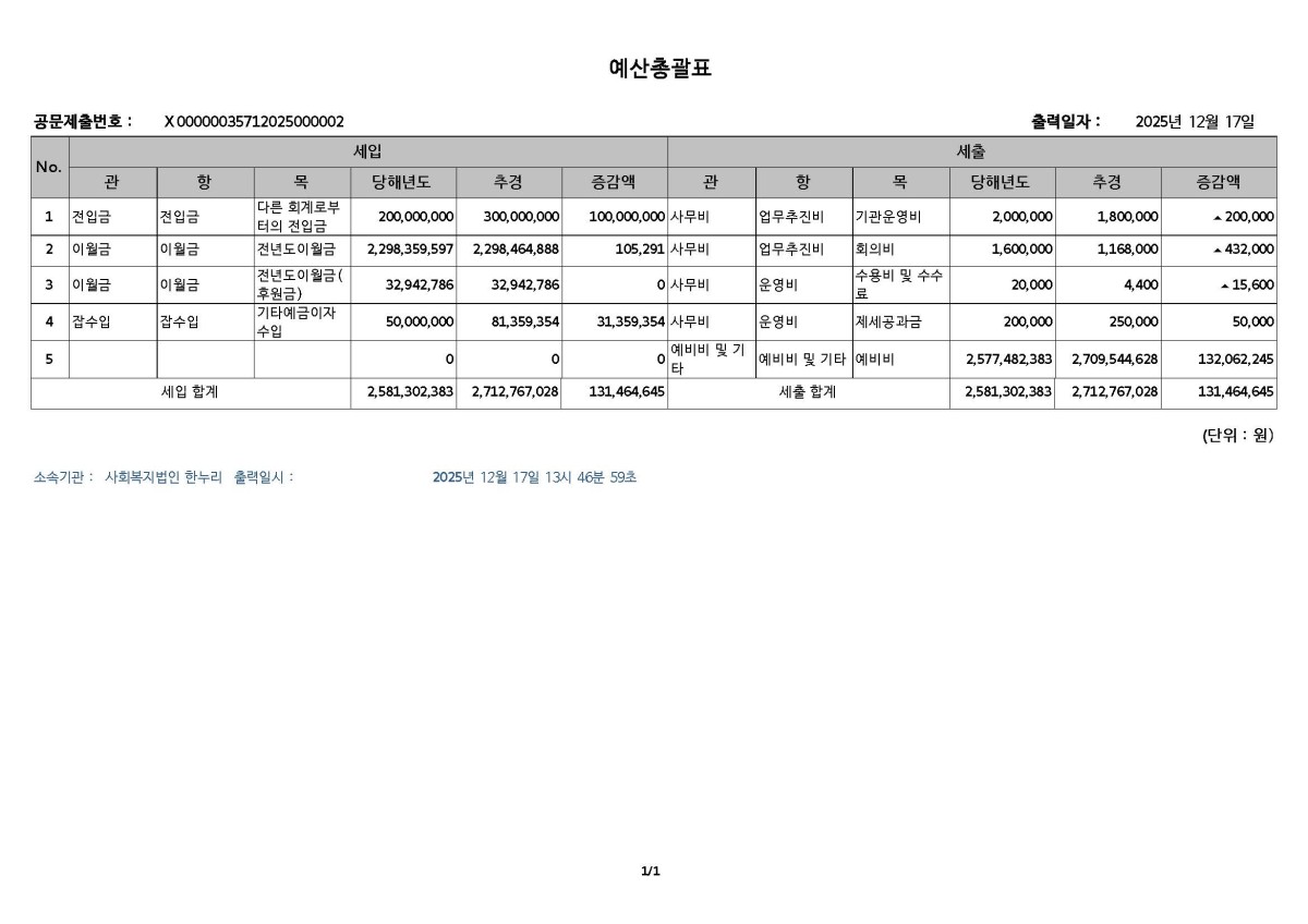[운영업무관련] 2025년 세입.세출 추경예산서(법인) 페이지 정보 작성자seokun 조회 95회 작성일 2026-01-08 09:37:33 댓글 0 list_alt목록 본문 # 세입.세출 추경예산총괄표(한누리) # 공고: 2026년01월08일~2026년01월31일 이전글 2026년 세입.세출 예산서(법인) 다음글2026년 세입.세출 예산서 (시설) 댓글 0 등록된 댓글이 없습니다.