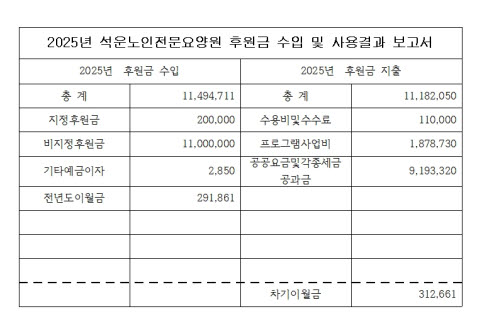 [운영업무관련] 2025년 후원금 수입.사용(석운) 페이지 정보 작성자seokun 조회 6회 작성일 2026-01-14 10:26:55 댓글 0 list_alt목록 본문 # 2025년 후원금 수입.사용 석운노인전문요양원 다음글2025년 후원금 수입.사용 (한누리) 댓글 0 등록된 댓글이 없습니다.