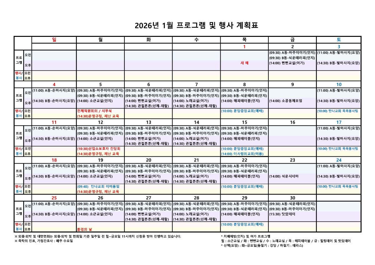 [공지] 2026년 1월 행사계획표 페이지 정보 작성자최고관리자 조회 292회 작성일 2026-01-02 12:38:03 댓글 0 list_alt목록 본문 다음글2025년도 제4차 운영위원회(251121) 댓글 0 등록된 댓글이 없습니다.