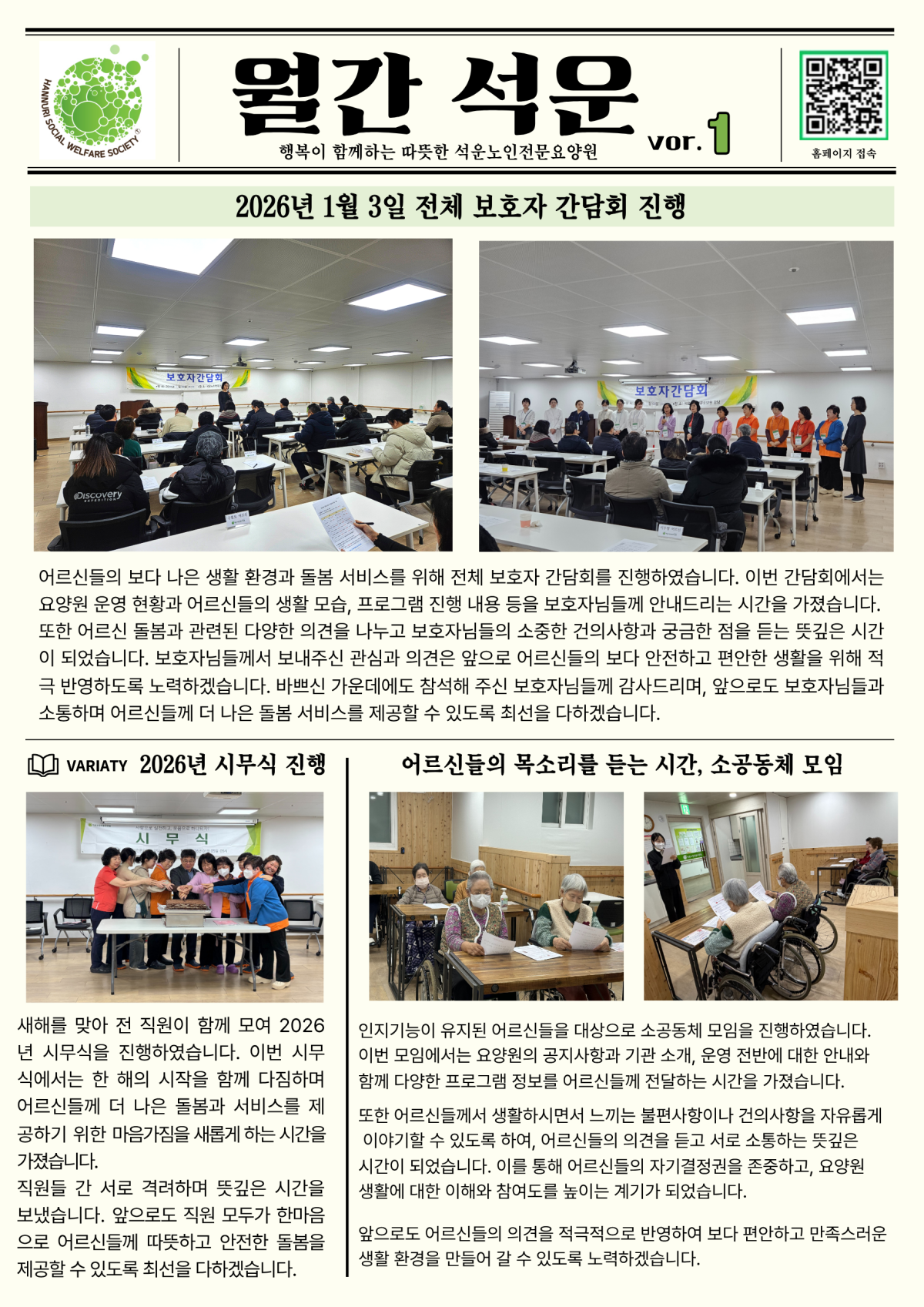 [공지] 1월 석운소식지 페이지 정보 작성자최고관리자 조회 3,589회 작성일 2026-02-11 09:54:18 댓글 0 list_alt목록 본문 석운노인전문요양원 2026년 '월간석운 1월호' 가 제작되었습니다. ★어르신 및 보호자님의 많은 관심과 구독 부탁드립니다★ 이전글 2026년 2월 월간소식지 다음글2026년 1월 5일, 전체직원회의 및 시무식 진행 댓글 0 등록된 댓글이 없습니다.