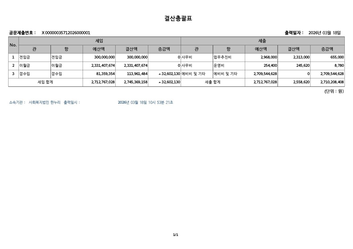 [운영업무관련] 2025년 세입.세출 결산서(사회복지법인 한누리) 페이지 정보 작성자seokun 조회 679회 작성일 2026-04-09 16:41:34 댓글 0 list_alt목록 본문 * 2025년 세입.세출 결산서 * 게시기간: 2026.04.09 ~ 2026.04.30 다음글2025년 세입.세출 결산서 (석운노인전문요양원) 댓글 0 등록된 댓글이 없습니다.