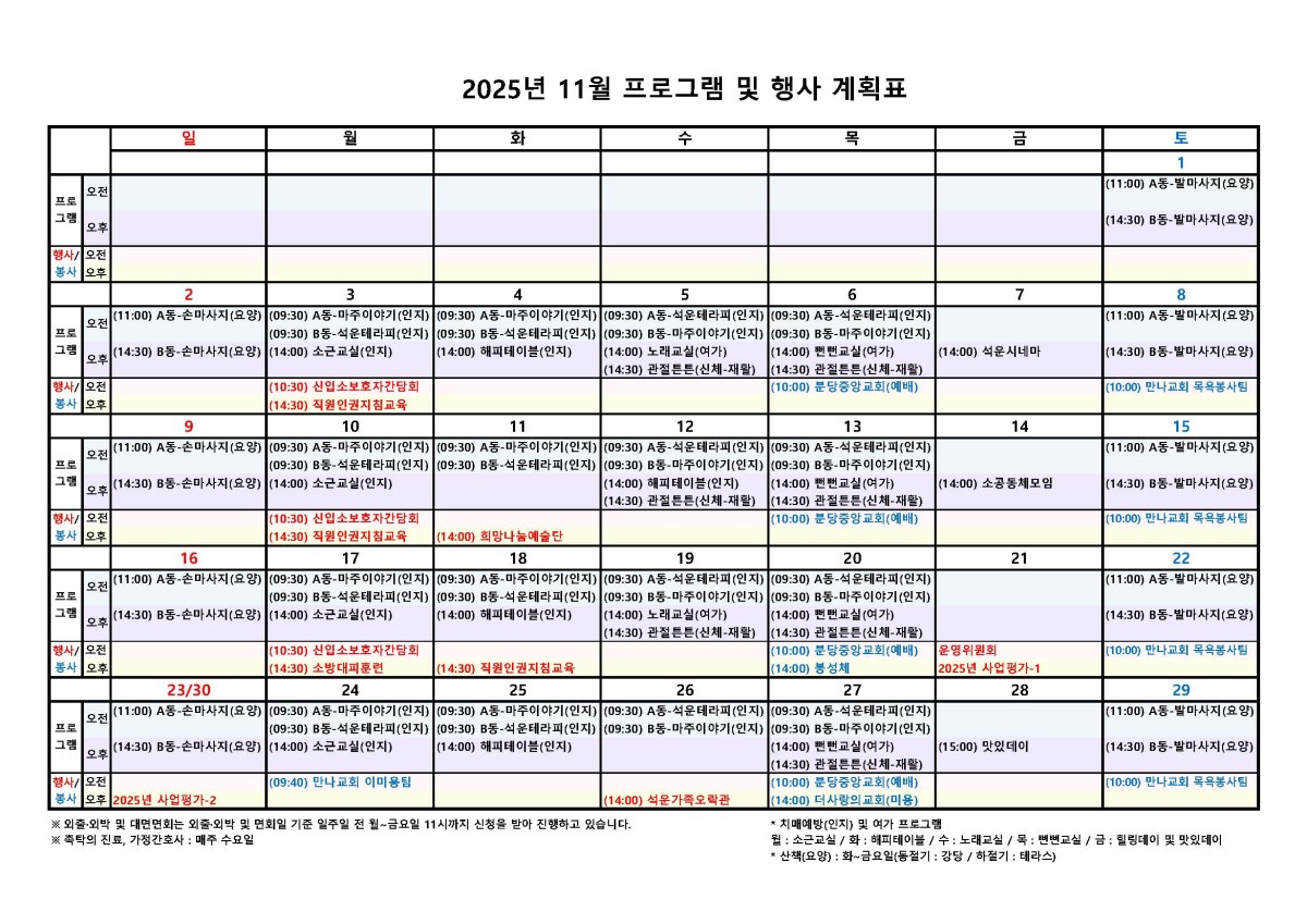 [행사프로그램] 2025년 11월 프로그램 및 행사 계획표 페이지 정보 작성자최고관리자 조회 6회 작성일 2025-11-07 08:52:08 댓글 0 list_alt목록 본문 다음글2025년 10월 프로그램 및 행사 계획표 arrow_forward list_alt 댓글 0 등록된 댓글이 없습니다.