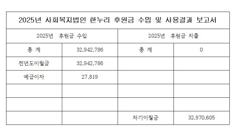 [운영업무관련] 2025년 후원금 수입.사용 (한누리) 페이지 정보 작성자seokun 조회 2회 작성일 2026-01-14 10:25:16 댓글 0 list_alt목록 본문 # 2025년 후원금 수입.사용 사회복지법인 한누리 이전글 2025년 후원금 수입.사용(석운) 다음글2026년 세입.세출 예산서(법인) 댓글 0 등록된 댓글이 없습니다.